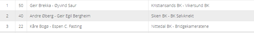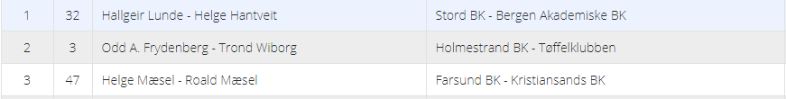 To par meldte og vant 6 ruter og vant tolv stikk: Fred Arne Moen-Jan Petter Svendsen og Ole Berset-Åsmund Forfot.
