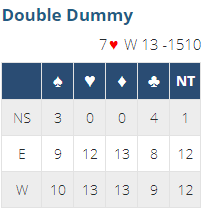 Hjerterkontrakt er mer «suspekt» da hjerteren må sitte 3-3 for å få tretten stikk, for spar må trumfes der også for å få det trettende stikket for spar knekt. Så at «par» (best mulige score) liksom er +1510 til Ø/V for 7 hjerter med tretten stikk er bare teori og egentlig tull og tøys hvis en snakker om praktisk bridge.