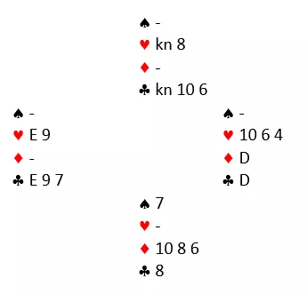 Ruter ut til K og spar10 tok seg av to første stikkene. På den andre runden spar kastet generalsekretæren ruter 9. Syd kunne brutt skvisen med å spille to ganger kløver, men det var ikke så lett å se så tidlig i spillet. Aktuelt ble fortsettelsen ny ruter som gikk til A mens bordet saket en liten hjerter.