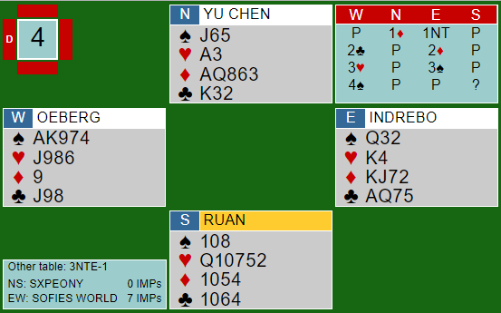 Ved det andre bordet gikk som du ser den kinesiske øst innpå med 1 spar. Syd sa 2 hjerter og vest 2 spar. Sofie (nord ) meldte 3 hjerter, og da sa øst 3 spar som ble sluttkontrakten med elleve stikk, Kina + 200 og 10 IMP til det norske laget som dermed tok en litt større ledelse før de siste fjorten spillene, 17 IMP.
