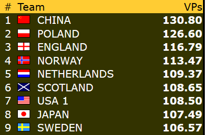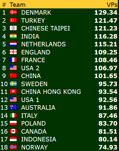Tredje dag av årets VM ble tøft for to av våre lag. I åpen klasse ble det hentet mindre enn 20 vinnerpoeng i løpet av tre kamper. Dermed er laget utenfor topp 8 for forste gang. For veteranene var det enda verre. De fikk ikke mer enn drøyt 11 VP. Det gikk bedre for damene. De sitter igjen med mer enn 40 vinnerpoeng etter dagens tre kamper, og vi kan glede oss over en oppløftende fjerdeplass så langt!