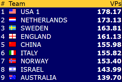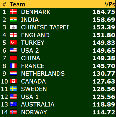 Fjerde dag av VM gikk heldigvis bedre for våre lag enn dagen før. Mens damelaget og veteranlaget sanket rundt 40 vinnerpoeng hver i løpet av tre runder, hentet laget i åpen klasse mer enn 48 VP! I åpen klasse og dameklassen ligger Norge innenfor topp 8. Veteranene har spilt seg noe opp i dag, men har fortsatt en vei å gå om det skal bli sluttspill.