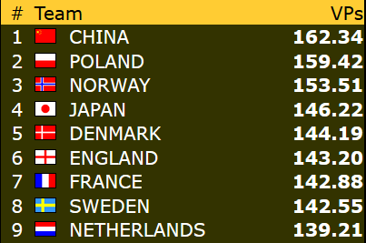 Etter dagens resultater er Norge dermed 2,6 VP bak mitt skjema til å nå sluttspill (justert etter motstand).
