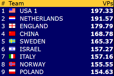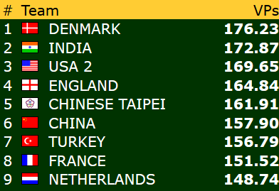 Det begynner å se lyst ut for de norske farger i OPEN og LADIES selv om det er langt igjen, kvalifiseringen er så vidt halvspilt. Begge lagene spiller veldig solid, og det er vanskelig å se noen svakhetstegn i det hele tatt. Ting kan snu seg fort, men jeg tror dette ordner seg og vi får to norske lag i sluttspillkamper i neste uke.