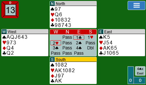 Ann Karin Fuglestad og Marianne Harding fant frem til 4 hjerter etter åpning 1 kløver fra nord, og der ble det ti stikk og +620. Spillet ga 14 IMP til Norge som tok ledelsen i kampen. Kontrakten 4 hjerter ville dog gått en bet om det spilles ut kløver er imidlertid.