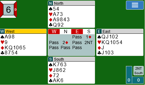 Gunn Tove Vist kunne benytte seg av en spesialkonvensjon mot nord sin 1 grand, 2 i major som viser firekorts farge og lang minor. Det bør være en hånd hvor man ville meldt inn 3 i i minor uansett, og dermed er det gunstig å få vist frem majorfargen på veien! Skottene kan kanskje ikke helt ha avalene i orden her? Syd bør ha en mulighet for å vise firekorts hjerter, for eksempel enkelt og greit en negativ dobling? Det fant imidlertid ut de hadde sparstopper, allright...så de prøvde 3 grand uten å bekymre seg særlig over GTV sin minorfarge. Og Gunn Tove spilte ut ruter dame som førte til at spillet var over på sekunder, seks ruterstikk og to ess til forsvaret, Norge +400.