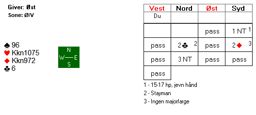 Du sitter i ugunstig sone. Makker starter med pass, før din høyre motstander åpner med 1 grand, som viser 15-17 hp. Tenker du melde deg på i meldingsforløpet med følgende hånd?