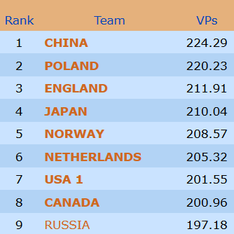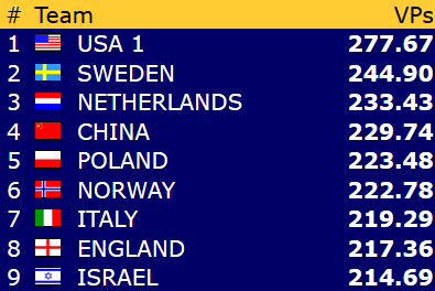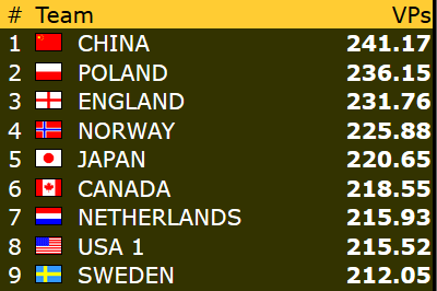 Norge ligger på fjerdeplass med nesten 13 VP ned til niendeplassen.