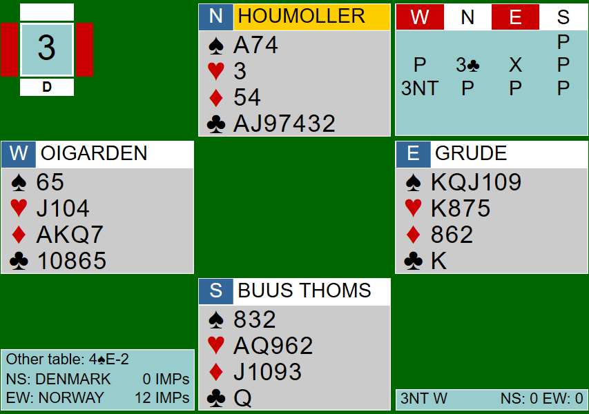 Men Bodil Nyheim Øigarden kom etter hvert ovenpå i 3 grand etter å ha fått ei hjelpende hånd fra dansken i nord. Liten kløver ut gikk til kongen i bordet. Bodil hadde ikke annet å gjøre enn å gå på sparen. Bjørg Houmøller lasjerte første gang, men stakk den andre sparen. Dermed var det ikke forbindelse i den farga. Inne på spar ess hadde hun kontraktens skjebne i sine hender. Aktuelt fortsatt hun i ruter, og da kunne hun aldri få for sine to stående kløver! Hun tenkte nok at hun ikke ville sette opp tieren for spillefører, men det var nok ikke veldig godt gjennomtenkt. Tenk så mange stikk makker må ha i de røde fargene for at det skal bli beit uten noen kløverstikk!