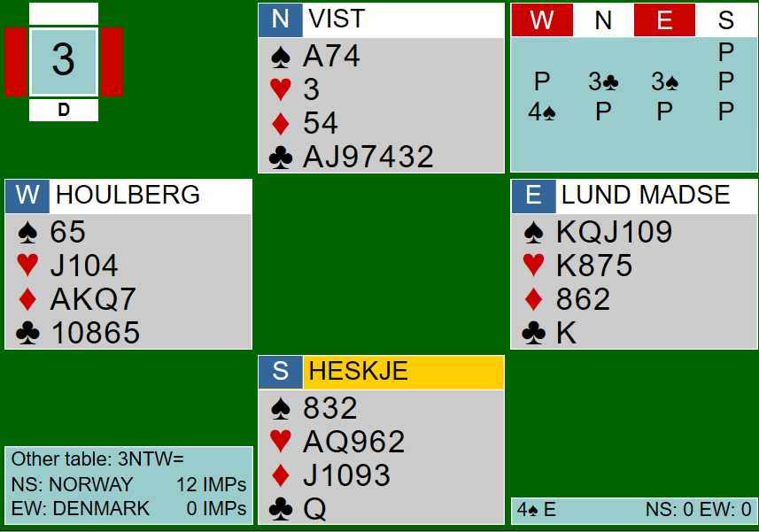 Ved det andre bordet fikk Torild og Gunn Tove 100 inn i 3 kløver doblet etter at vest åpnet med 3 kløver og Torild gjenåpnet med ei doblin i sistehånd etter å ha passet først. Det var helt naturlig for Gunn Tove å passe ut, men det var ikke mer enn ei beit. 13 nye IMP til Norge.