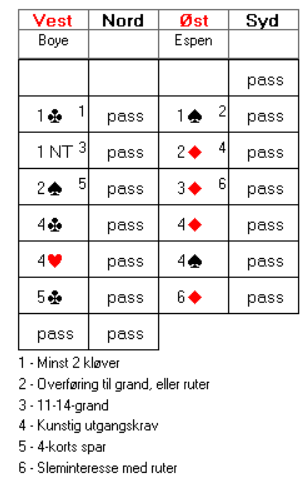Også i åpen klasse ble det slemsving til Norge da Boye og Espen meldte 6 ruter på følgende vis, mens USA stoppet i 3 grand ved det andre bordet: