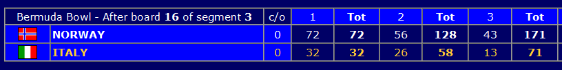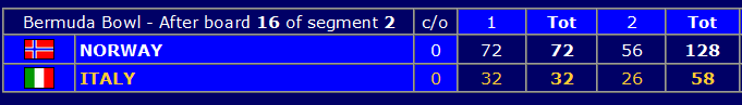 Halvveis i kvartfinalen leder Norge med hele 100 IMP på Italia i åpen klasse etter å ha vunnet de tre settene i dag med henholdsvis 40, 30 og 30 IMP! Mye skal gå galt om de nå ikke går videre til semifinale (bank i bordet). Men det er fortsatt 48 spill igjen, og det er viktig å være fokusert selv om man leder mye.