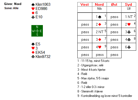 Ulf fikk etter hvert gode kort da makker viste fram ei maxhånd med ei viss kløvertilpasning. 3 ruter fra Nils viste nemlig minst dobbelton kløver og enten singleton eller renons i ruter. 4 hjerter viste kontroll og fortalte samtidig om minst fem kontroller. Esset teller som to, mens konger og trumfdama teller som én. Med den informasjonen Ulf hadde til rådighet måtte det være godt spill for lilleslem.