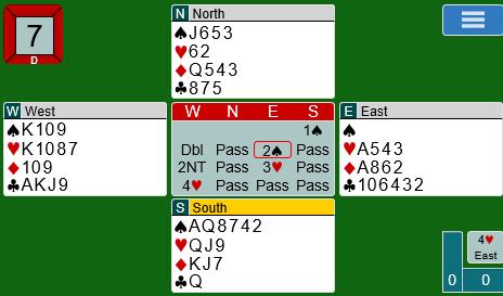 2 kløver fra Nils var presisjon, opp til 15 honnørpoeng og minst 5-korts kløver. Guadeloupe havnet etter hvert i 4 hjerter. Det var ingen optimal kontrakt. Sjansene var langt bedre i sparkontrakt. Heldigvis meldte Allan og Terje seg fram til 4 spar. Hvordan det skjedde er imidlertid uvisst da det ikke er loggført på BBO. Om motparten starter med to kløverstikk, må trumfen løses uten taper og ruteren med én taper. Slik det sitter er det rimelig å fikse dette.