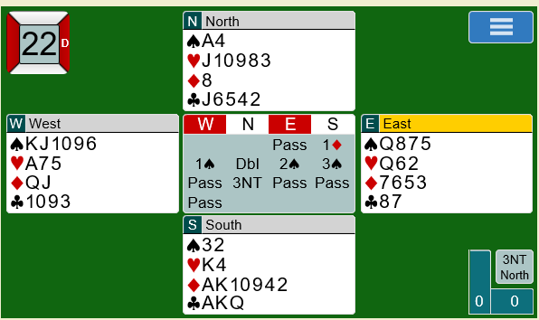 Boye og Espen havnet i 3 grand. Med åpne kort står kontrakten selv om inntaket til kløveren blir tatt vekk i utspillet. Årsaken er den heldige rutersitsen. Men Espen valgte å seile ruter 8 i stikk to! Da ble det et par beit. Ved det andre bordet ble 5 kløver spilt hjem.