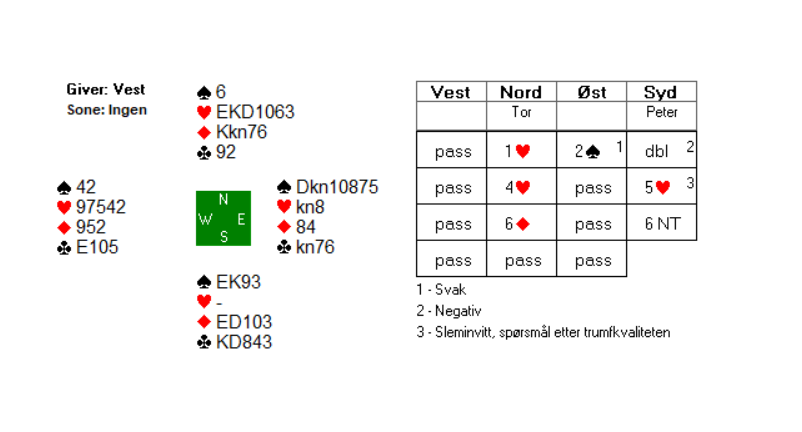 Peter kunne bare kaste motsatt av øst, og dermed tok han de to siste stikkene på hånda. Hjemgang i prosjektet var verdt 2 IMP da kontrakten var 6 ruter med tolv stikk ved det andre bordet.