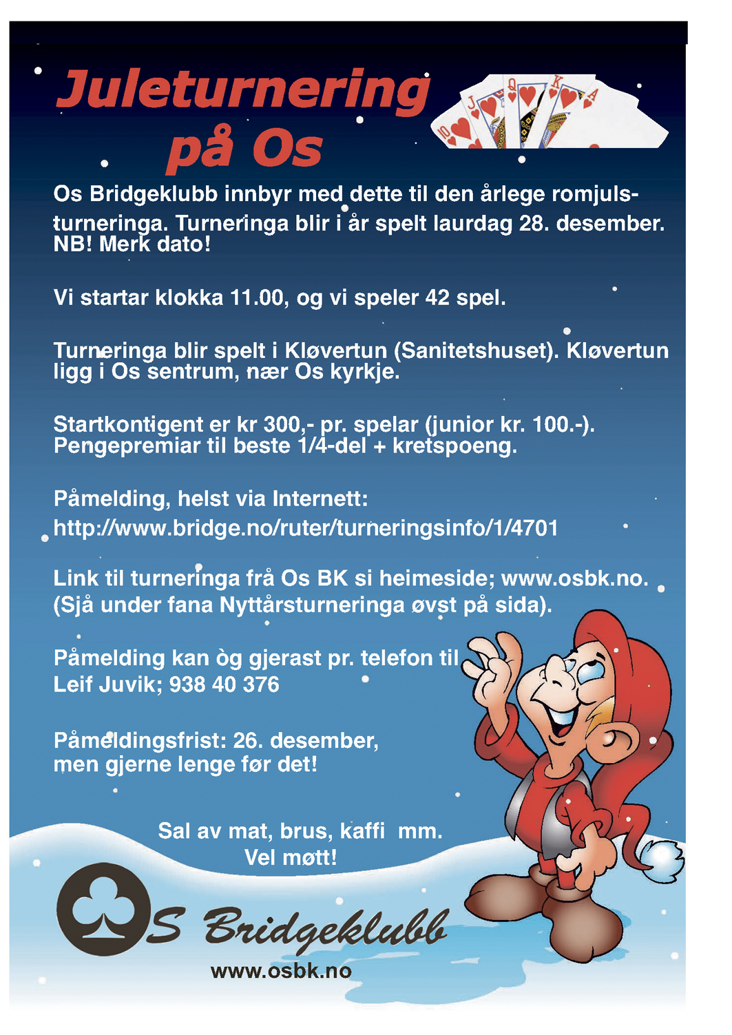 Den årlige klubbkampen mellom Konnerud og Holmestrand (Galleberg og Holmestrand bridgeklubber er slått sammen under navnet Holmestrand bridgklubb) spilles i år på Sørvangen med Kponnerud som arrangør. Spilledagene 5.11, 12.11 og 19.11. Påmeldingsliste legges ut på spillekveldene fra og med 15.10. Startkontingent kr 250 pr. spiller for hele turneringen betales første spillekveld. Påmelding kan også skje via telefon eller e-post, tlf. 97148187 eller olav.vee@online.no. Siste frist for påmelding er søndag 3.11.