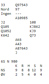 N/S har ikke mer enn 22 HP til sammen. Det er 3-4 poeng for lite til utgang skal man tro læreboka. Her står imidlertid slem i spar!