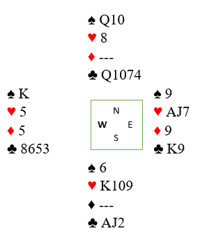 De som vant 3 NT stakk med spar knekt i stikk en og spilte ruter dame til kongen og esset. Så ruter til knekten og mer ruter. Syd kom heldigvis inn og spilte spar. Spillefører stikker den med esset og kan spille liten hjerter mot damen. Her kan det virke naturlig å spille hjerter dame fordi spillefører fortsatt er "redd" for den sårbare kløverfargen og ikke vil risikere at nord kommer inn hvis han har hjerter konge. Men kan det aldri bli mer enn to hjerterstikk. Hvis hjerter dame spilles kan det fortsatt lykkes med et skvisinnspill mot syd, men da en litt mer koplisert sluttposisjon enn det som i def følgende beskrives.