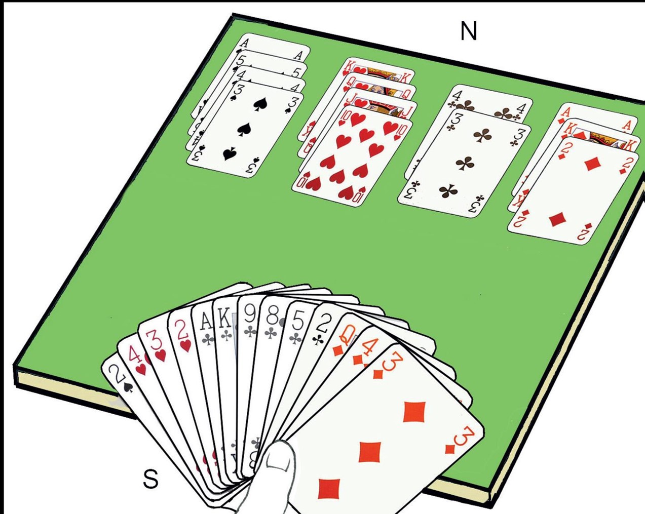 Vi lar altså Vest vinne de to første stikkene på spar K og spar Q. Deretter tar vi det tredje stikket med spar A og spiller inn Øst på hjerter A. Seks stikk i de andre fargene pluss tre i hjerter gir ni stikk totalt.