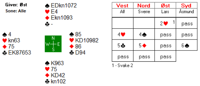 Lars vant med hjerter knekt og returnerte en ruter til stjeling hos Alf. Dermed 14 IMP til lag Anderssen etter at det ble 850 i 5 spar doblet ved det andre bordet.