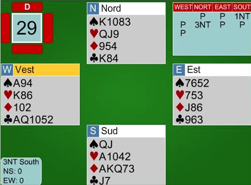 Syd åpner med 1 grand (15-17), og nord sier 3 grand. Din tur som vest, hva spiller du ut?