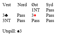 Det er klart at spillefører godt kan tråkke feil her, for eksempel spille på at nord har hjerter ess. Merk at det ikke hjelper forsvaret om nord hopper opp med ruter ess med det samme og spiller hjerter knekt. Siden ruter dame kommer på får i så fall spillefører to ruterstikk. Og å legge i hjerter knekt i sluttposisjonen hjelper ikke da øst dekker, og nieren blir en stopper og syd må uansett gi øst niende stikket i den fargen. Å vinne 3 grand vil nok gi Ø/V en meget god score her. N/S: -600