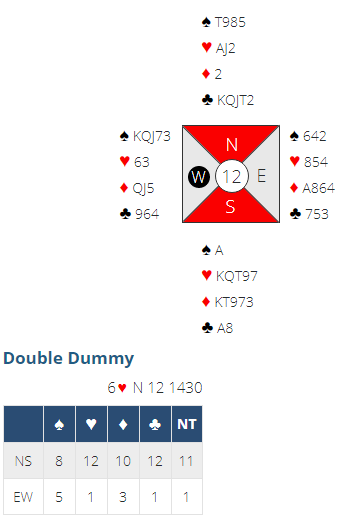 Lilleslemmen er meget god. Spillefører behøver kun en ruterstjeling hos nord for å komme til tolv stikk, ruter konge er faktisk irrelevant! Han kan spille ruter med det samme, fra syd sin hånd om han vil. Senere tas en ruterstjeling hos nord og det blir seks trumfstikk i alt pluss spar ess og fem kløverstikk, totalt tolv stikk. Å sitte mot 6 hjerter her blir ikke Ø/V særlig rike av, for i dette spillet blir det ganske sikkert mange flere utganger enn slemmer. N/S: +1430 //