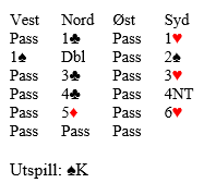 Ø/V-paret som satt mot det ergrer seg nok da vest burde funnet spar ut som effektivt tar knekken på den slemmen, det er bare elleve stikk uten ett i ruter. Uten å være brutal må det vel være lov å si at det neppe kan fnnes et bedre utspill mot 6 grand enn KQJ i en farge. Å bete 6 grand ville gitt Ø/V delt topp med ett par som satt mot 7 hjerter med en bet.