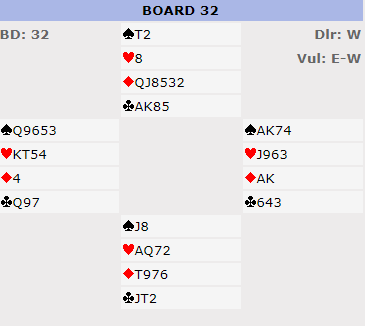 Jeg skiftet til hjerter i andre stikk, men det er nok en motspillsfeil når makker har hjerter ess og ikke kløver 9. Hvis nord vet at det er slik (at makker har hjerter ess) bør kløver ess innkasseres i andre stikk, så hjerterskift. Da kan ikke motspillet gå galt, syd vet det skal spilles hjerter tilbake i fjerde stikk. Men da han kom inn på esset i andre stikk var det ikke så enkelt. Nord kunne jo godt hatt dobbel hjerter og AK10x i kløver, og da må kløver gjennom til for å bete kontrakten.