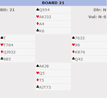 Kun 10% av N/S parene meldte 7 spar. Den er ikke helt nedlegg siden trumfen sitter 4-1, men det går greit etter to trumfrunder å ta to store kløver og stjele en kløver. Selv om den fargen ikke hadde blitt godspilt som her ville det vært tretten stikk med fem sparstikk (en stjeling og fire trumstikk på den andre siden), fem hjerterstikk, ruter ess og ess-konge i kløver. Siden kløverstjelingen må tas før trumfen tas ut (siden sparfargen satt 4-1) kan ikke kløverfargen sitte verre enn 4-2 for at det skal gå bra.