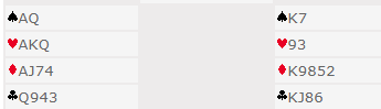 Syd er giver og ingen i faresonen. Du ser sikkert at beste kontrakt her er å komme i 7 hjerter. Men hvordan skal dere klare det uten rent gjettverk underveis. De sentrale verdiene i spillet er at dere har gående hjerterfarge med tilpasning 5-6, Syd er renons i spar men har flott 5- korts kløverfarge der esset mangler, men det har jo makker i Nord.