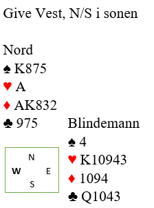 Meldingene gikk på mange forskjellige måter, men la oss si vest åpner med 1 hjerter som du (nord) dobler. Øst hopper til 4 hjerter før det går pass rundt. Du spiller ut en ruterhonnør (Ess eller Konge, alt etter avtaler). Makker legger femmeren og vest damen. Hva gjør du i stikk 2?
