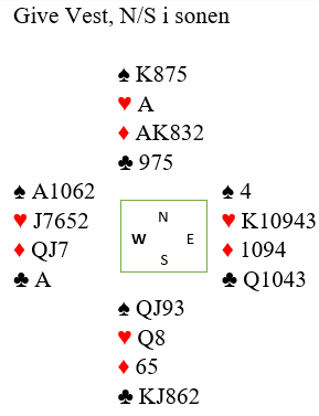 Vi tar med et av Vestveits mange gode spill i denne turneringsserien. Spillet forekom i en simultanturnering i februar, og da vant Vestveit sammen med toeren på sammenlagtlisten, Jørgen Petter Nermo. De hadde hele 73,8%, men det var bare 0,6% foran toerne den kvelden, Per Haltbrekken-Arnfinn Helgemo fra Lundamo BK. Siri Gro Drivdal-Erik Jørgensen (Mandals BK) hadde også over 70% i det 380 par store feltet.