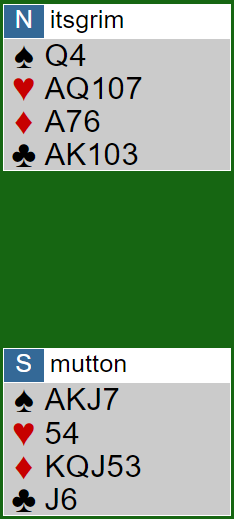 Om lag De Botton var litt heldige da de vant en stor slemsving i spillet som ble fortalt i går, så var de ganske uheldige i det spillet du får presentert i dag. Denne gang dreier det seg om en storeslem fra kampen mot lag BLASS i ALT 3 turneringen som pågår denne uken på BBO.
