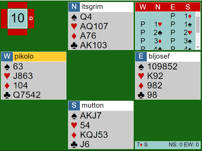 Ved det ene bordet spilte lag BLASS 6 ruter. Jason Hackett og Alexander Hydes hadde større ambisjoner og førstnevnte skulle spille 7 ruter. Han fikk trumf ut fra vest og øst fulgte farge.