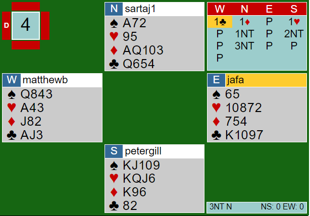Jeg har ikke analysert så veldig på hva som er beste spilleplan her, det kan du pusle litt med selv når du får hele spillediagrammet. Men det er antagelig greit nok å satse på at kløveren går? Han spilte derfor en stor hjerter fra øst etter å ha truffet utspillet med hjerter 8 (viktig å bevare hjerer 2 da det kan være ett ekstra inntak til vest på hjerter 7 om trumfen sitter 3-1 hvis nieren sitter singel). Etter en trumfrunde var han allerede bet. Hele spillet så slik ut: