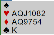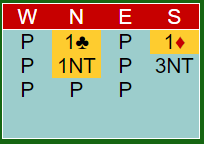 Med vest som giver og alle i sonen åpnet vest med 1 kløver, og nord meldte inn 1 spar. Nå viser øst hjerterfargen (han som satt øst sa 2 ruter som for dem viser hjerterfarge i den posisjonen). Selvsagt kom det en høy melding fra syd: 4 spar! Det gikk to passer, og det var øst sin tur igjen.