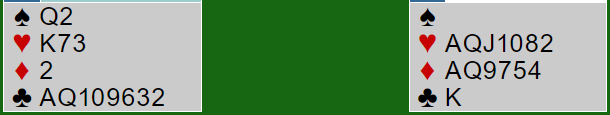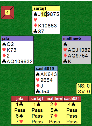 Vest har nok støtte en plass, men har må ha en god kløverfarge som han tror kan være alternativet som trumf. Øst kunne sagt 7 kløver med for eksempel 0-5-5-3, men er selv ikke med på makkerens forslag det med dette. Han sa 7 ruter som vest korrigerte til 7 hjerter.