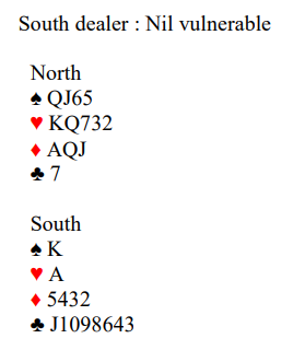 Ved det ene bordet spilte vest ut ruter konge, og slik så hele spillet ut: