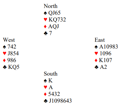 Etter spar ess, tre runder kløver og ruterskift ser det ut som en blokkering av hjerterstikkene, men det er en illusjon. Det er bare å stikke opp med ruter ess og ta for spar dame med avkast av hjerter ess. Deretter har du fortsatt spar knekt og konge-dame i hjerter som gir avkast for tre ruter hos syd.