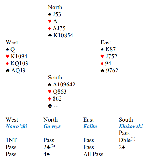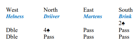 Det var litt merkelig at syd som passet først valgte å hoppe til 2 spar. Hva tror du han har? Det var også litt merkelig at nord passet da du doblet opplysende over 2 spar, for så å melde utgang. Han må jo tro 4 spar står når han melder det nå? Kanskje han tenkte omtrent slik: «en vet jo aldri, kanskje kontrakten blir 2 spar doblet» . De har jo hendt før at motparten har misforstått hverandre, og kanskje øst passer ut doblingen, men da øst meldte 3 hjerter sa altså nord 4 spar.