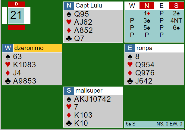 Ved det andre bordet meldte også N/S 6 spar, men der spilte Jason Hackett ut kløver ess, og det ble en bet. Spillet ga 17 IMP til lag DE BOTTON som vant kampen med 15 IMP.