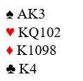 Motparten i vest åpner 1NT, øst spør om majorene til sin makker, men vest har ikke majorer og kontrakta blir til slutt 3NT. Makker spiller ut en liten hjerter, og bordet kommer ned: