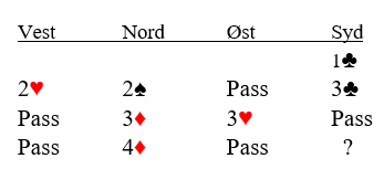 Det er minimum, men jeg ville nok åpnet med 1 kløver med så god farge. Det har imidlertid ikke så mye med saken å gjøre. En av de «skyldige» sa 1 kløver, og vest hoppet inn med 2 hjerter (svakt innhopp). Nord sa 2 spar (10+hp, minst fem spar). Etter pass fra øst sa syd 3 kløver, og makkeren meldte 3 ruter før øst også kom med i meldingene med 3 hjerter. Nå passet syd, og så langt er vel alt helt normalt. Nord kom så tilbake med 4 ruter. Det kan kanskje være litt delte meninger om det er krav? Kanskje kan nord ha bare en fin fordelingshånd og 10-12 poeng? Vel, du må vel melde selv om situasjonen ikke er helt avtalt i ditt makkerpar. Og selv med helt minimums åpning har du tross en honnør i hver av makkerens farger, ikke så galt. La oss si du ikke tør si pass. Hva melder du da?
