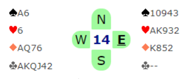Sælensminde-Erichsen hadde tilsynelatende ikke store problemer her. Det startet med 1 hjerter-2kløver og 2 ruter fra åpneren. Vest høynet til 3 ruter som krav. Deretter fant vest ut at det måtte være en bra sjanse i 7 ruter siden øst underveis fikk vist hjerter ess og ruter konge (to Keycards). Slik så hele spillet ut: