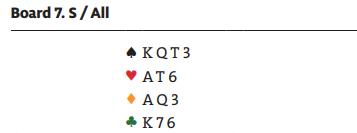 Dette er sitsen som gjør at det er bedre sjanse å forlange damen i fargens andre runde, akkurat hva Sælensminde gjorde i den 3NT-kontrakten som ble fortalt hvor han vant ni stikk mens Brogeland-Sælensminde betet 3NT på spektakulært vis.