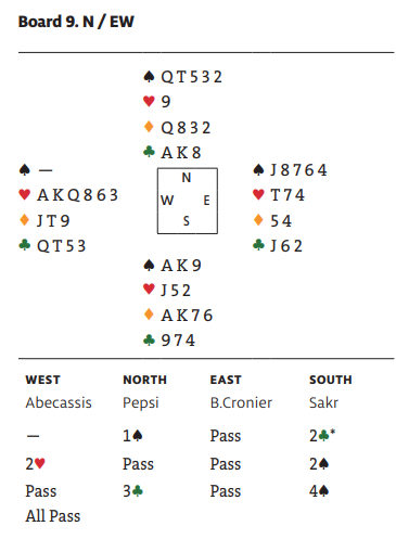 Pepsi (Jacel Pszcola, opprinnelig fra Polen, men bosatt i (USA) var i 4 spar som nord. Øst spilte ut makkerens farge, hjerter. Vest stakk med damen og fortsatte med kongen som nord trumfet. Det så ut som et uinteressant spill i ett sekund, eller to, men trumf til esset i tredje stikk avslørte at trumfen satt 5-0. Nord var allerede blitt kortet en gang og øst hadde nå en trumf mer enn spillefører. Det var ingen grunn til panikk for det!