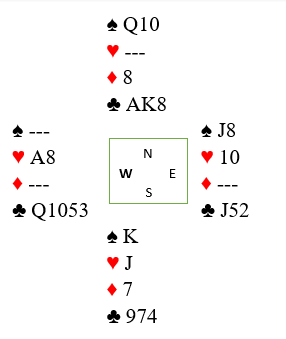 Etter en runde trumf fortsatte han med ruter ess og ruter til damen. Øst fulgte begge gangene. Nå var resten barnemat for lagkapteinen på vinnerlaget. Han spilte spar til finesse med nieren fulgt av ruter konge som øst måtte trumfe, og dette var blitt situasjonen: