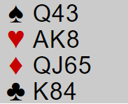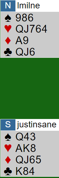 Finessen lyktes, men det hjelper ikke for å få fire stikk i fargen. Du får nok en hjertertaper uansett til nords gjenværende knekt dobbel. Hva om vi bytter plass for knekten og kongen? Da ser det altså slik ut fra start: